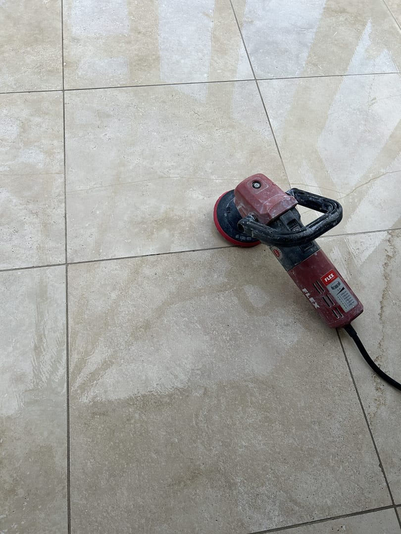 In these pictures you can see a shower wall that had been cleaned with a toilet cleaner and damage resulted. Using our specialist pads we cut back and removed the damage, once removed we began polishing the tiles to match the other tiles in the shower. In this instance the client loved the natural & light colours of the stone and didn’t want a high shine.